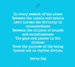 Acknowledge… Betwixt and between The you & I, The us and the we, Is a ocean of multiverses. A tapestry of metaverses Springing into existence Creating connection Beyond compare Ingenious innovation Reaching beyond the known Forging ahead dimensions Unfolding technology With palpable sensations Creating new possibilities Exploring potential Understanding elements Of space, time and distance Challenging norms Quantifying needs & wants Finding solutions In a changing world Simplifying complexities In the realms of life & living.